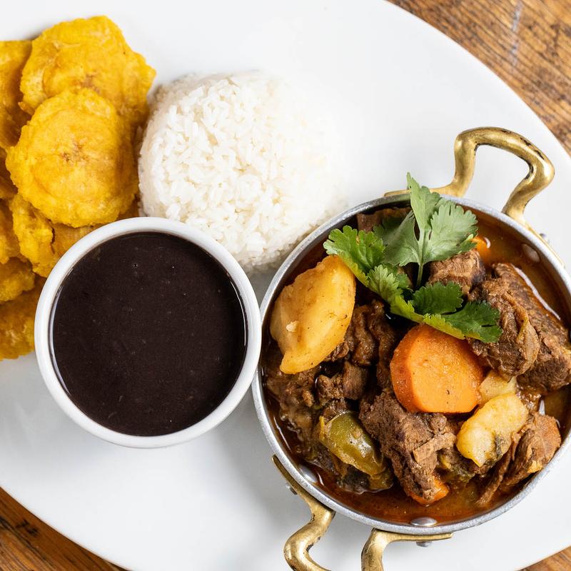 Beef stew served with a choice of side rice and beans